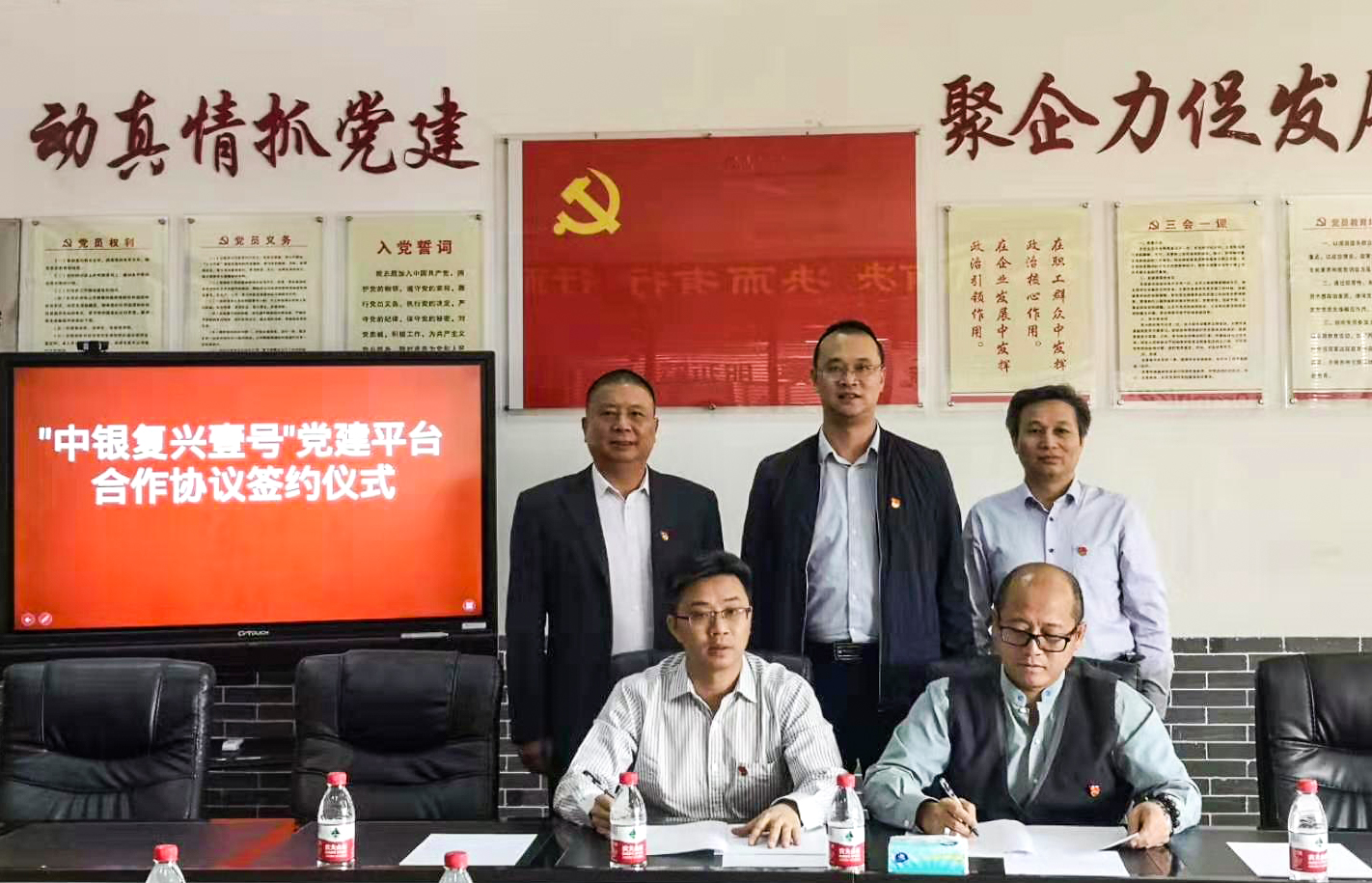 簽約儀式中,中國銀行東莞大嶺山支行行長、黨支部書記孫玉成與匯興智造董事長鐘輝共同簽署《“中銀復興壹號”黨建平臺合作協議》,就主題教育開展、基層黨組織互聯共建等方面進行了深入溝通交流。