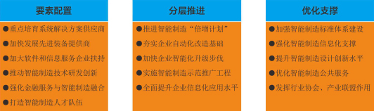 在重點行業領域開展智能制造試點工程建設,推廣10個智能示范車間,建設100條以上普及型智能制造示范線,支持100個智能化升級改造項目。