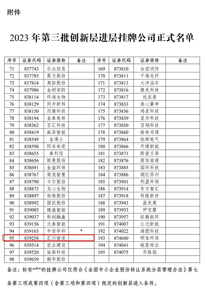 全國中小企業股份轉讓系統有限責任公司于2023年5月17日在其官網發布的《關于2023年第三批創新層進層決定的公告》(股轉公告【2023】 200 號),廣東匯興精工智造股份有限公司(股票代碼:839258)憑借持續增長的經營業績從眾多基礎層掛牌公司中脫穎而出,2023年5月19日正式進入新三板創新層,邁向更高層次的資本舞臺。