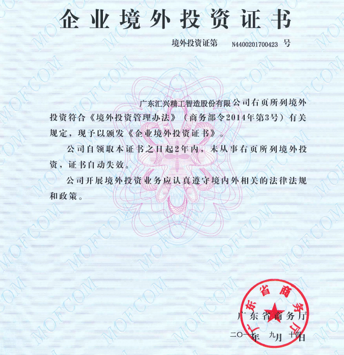 2017年8月29日,廣東匯興精工智造股份有限公司(股票代碼:839258)正式獲得企業(yè)對外投資證書。匯興智造赴德設(shè)立......